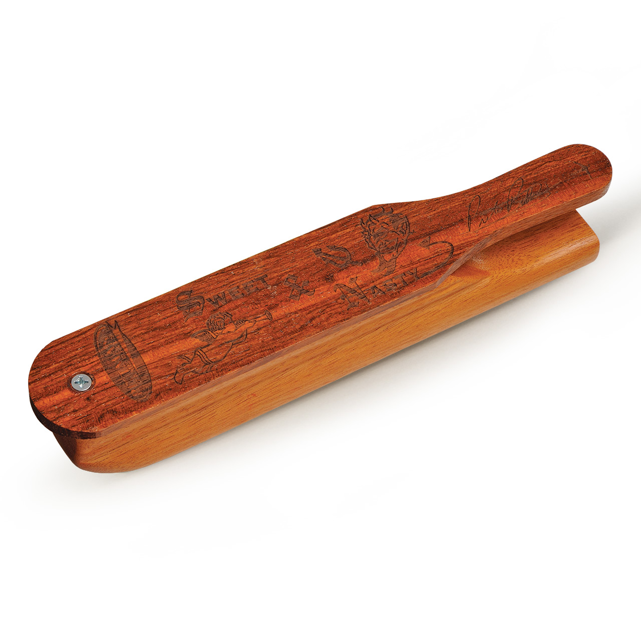 The Sweet & Nasty is a boat type turkey caller with the logo on the exotic bibinga wood lid on a hardwood chassis. Custom-made and hand-tuned, the Sweet & Nasty really screams. It is ideal for soft, sweet calling, long-range, high-wind, and locating calling. Use it to reproduce the highest frequency and softest, sweetest sounds known.